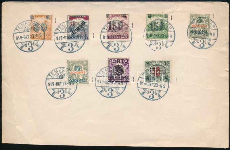 Signed: B... https://www.darabanth.com/de/45-Gross-Auktion/45.1/Philatelie-und-Postgesichte-Ungarn-Online/Besetzung-und-Lokalausgabe-1919-1921-Temesvar~18758/1919-Cimzetlen-boritekon-8-db-belyeg-8-stamps-on-envelope3Cbr-3E-Signed-Bodor~II3447475