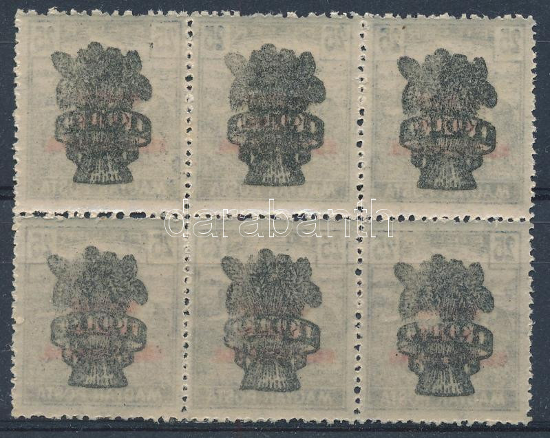 Beschreibung: 1920 Búzakalász 25f hatostömb a felülnyomat gépszínátnyomatával / Mi 300 block of 6 with machine offset