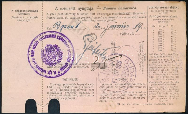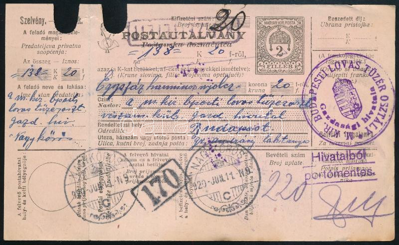 Beschreibung: 1920 Teljes postautalvány / Money order "M. KIR. BUDAPESTI LOVAS TÜZÉR OSZTÁLY Gazdasági hivatala"