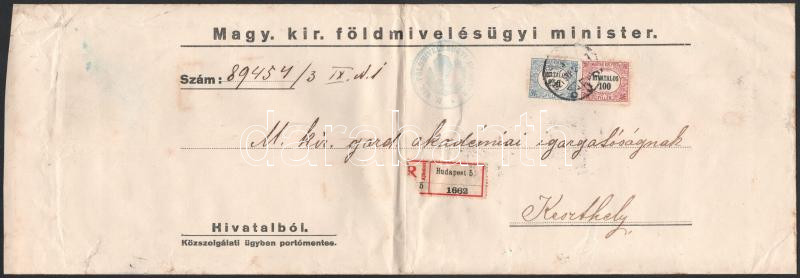 Beschreibung: 1921 Nagy alakú ajánlott levél 2 db Hivatalos bélyeggel / Registered cover with official stamps