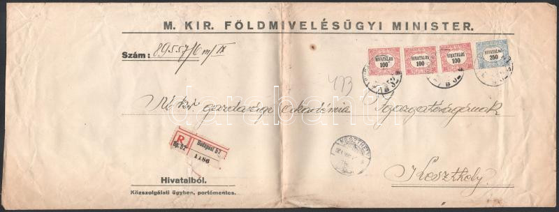 Beschreibung: 1921 Nagy alakú ajánlott levél 4 db Hivatalos bélyeggel / Registered cover with official stamps