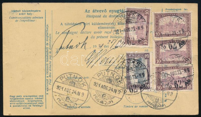Beschreibung: 1921 Teljes csomagszállító 43K bérmentesítéssel / Complete parcel card with 43K franking "BUDAPEST" - "PUTNOK"