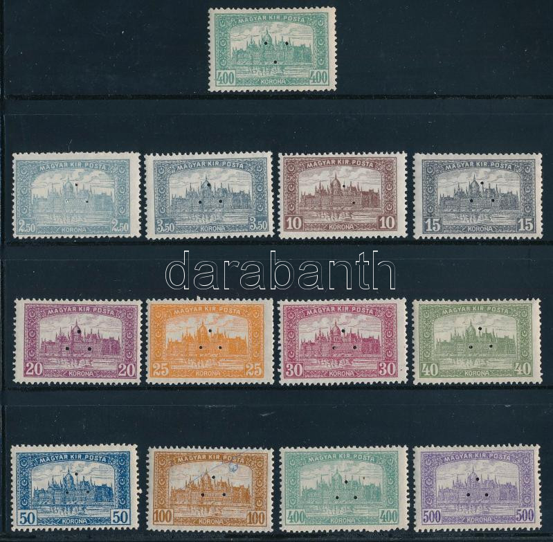 1921/1923 Parlament hármaslyukasztású sor + 400K fordított lyukasztással (3,50K törés) / Mi 355-366, set with 3-hole punches + Mi 365 with the holes inverted (Mi 356 fold)