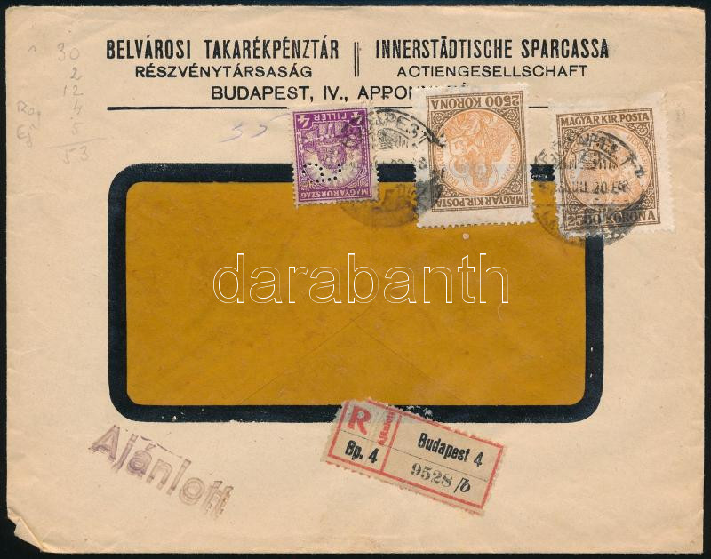 1926 Budapest helyi ajánlott levél 5000K és 4f (perfin) vegyes bérment... https://www.darabanth.com/de/45-Gross-Auktion/45.1/Philatelie-und-Postgesichte-Ungarn-Online/Korona-filler-Mischfrankatur~18872/1926-Budapest-helyi-ajanlott-level-5000K-es-4f-perfin-vegyes-bermentesitessel-Local-regist~II3450272
