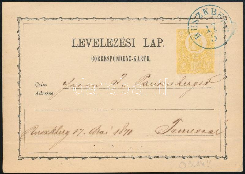 ~1871 2kr díjjegyes levelezőlap / PS-card, kék / blue "RUSZKBERG&... https://www.darabanth.com/de/45-Gross-Auktion/45.1/Philatelie-und-Postgesichte-Ungarn-Online/Kupferdruck~18738/7E1871-2kr-dijjegyes-levelezolap-PS-card-kek-blue-RUSZKBERG~II3451876