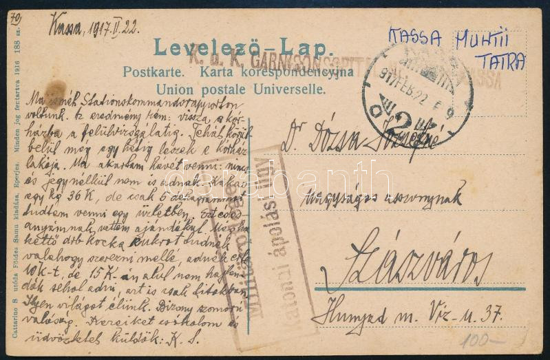 Beschreibung: 1917 Tábori posta képeslap / Field postcard "K.u.k. GARNISONSSPITAL" + "KASSA" + "Katonai ápolási ügy"