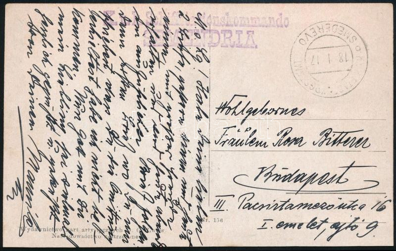 1917 Tábori posta képeslap Budapestre küldve / Field postcard to Budapest "K.u.K. ETAPPENPOSTAMT / SMEDEREVO" , "K.u.k. Schiffstationskommando / SEMENDRIA"