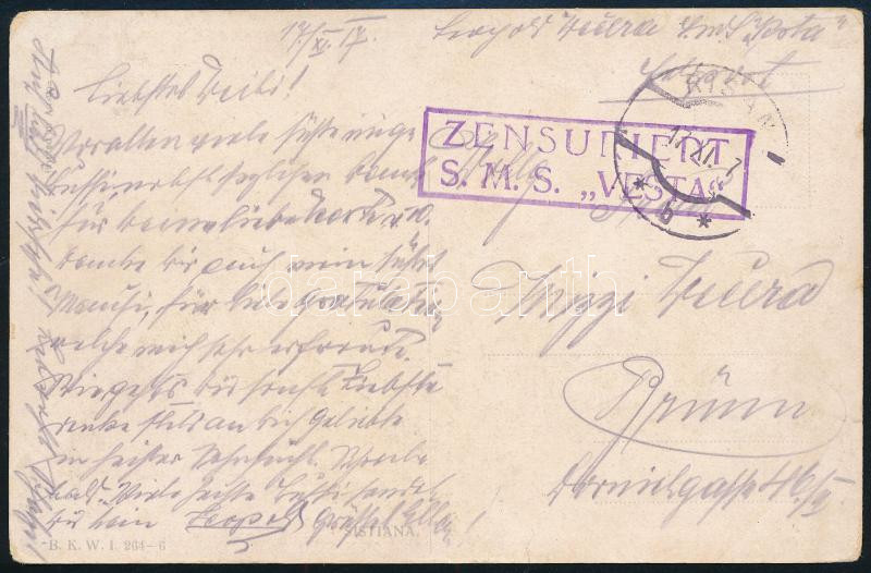 1917 Tábori posta képeslap / Field postcard "S.M.S. VESTA" https://www.darabanth.com/de/45-Gross-Auktion/45.1/Philatelie-und-Postgesichte-Ungarn-Online/Osterreich-Ungarische-Feldpost-Erster-Weltkrieg-Marine~18750/1917-Tabori-posta-kepeslap-Field-postcard-SMS-VESTA~II2989979