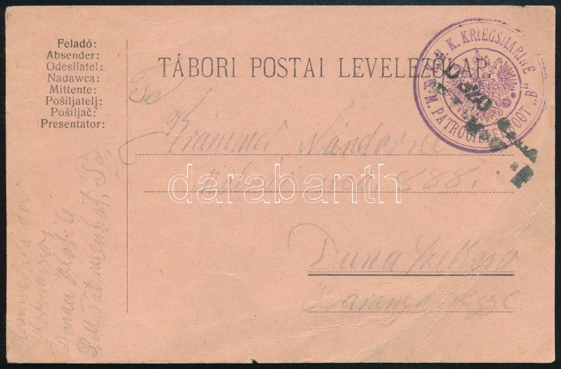 Beschreibung: 1917 Tábori posta levelezőlap Dunaszekcsőre küldve / Field postcard "K.U.K. KREGSMARINE / S.M. PATROUILLENBOOT B"