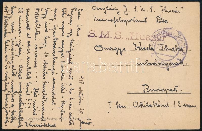 1918 Tábori posta képeslap / Field postcard "S.M.S. HUSZÁR" https://www.darabanth.com/de/45-Gross-Auktion/45.1/Philatelie-und-Postgesichte-Ungarn-Online/Osterreich-Ungarische-Feldpost-Erster-Weltkrieg-Marine~18750/1918-Tabori-posta-kepeslap-Field-postcard-SMS-HUSZAR~II2486974