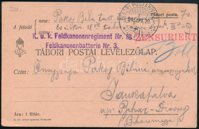 1915 Tábori posta levelezőlap / Field postcard "K.u.k. Feldkanone... https://www.darabanth.com/de/45-Gross-Auktion/45.1/Philatelie-und-Postgesichte-Ungarn-Online/Osterreich-Ungarische-Feldpost-Erster-Weltkrieg~18748/1915-Tabori-posta-levelezolap-Field-postcard-Kuk-Feldkanonenregiment-Nr-18-Feldkanonenbatt~II3444166