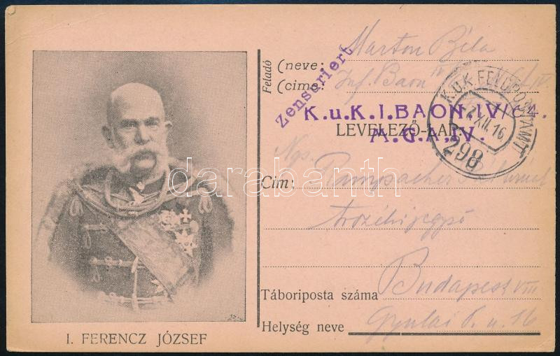 1916 Tábori posta levelezőlap / Field postcard "K.u.K. I. BAON. I... https://www.darabanth.com/de/45-Gross-Auktion/45.1/Philatelie-und-Postgesichte-Ungarn-Online/Osterreich-Ungarische-Feldpost-Erster-Weltkrieg~18748/1916-Tabori-posta-levelezolap-Field-postcard-KuK-I-BAON-IV64-MGAIV-plus-FP-298~II3258694