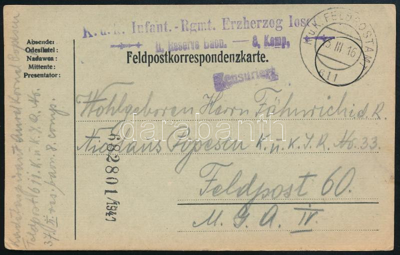 Beschreibung: 1916 Tábori posta levelezőlap / Field postcard "K.u.k. Infant.-Rgmt. Erzherzog Josef II. Reserve baon. 8. Komp." + "FP 611"
