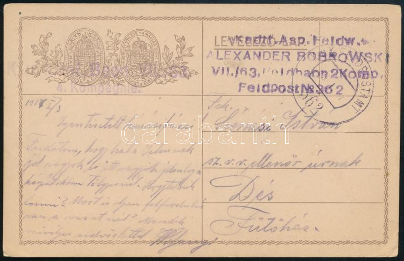 Beschreibung: 1917 Tábori posta levelezőlap / Field postcard "ALEXANDER BOBROWSKI VII./63. Feldbaon 2 Komp" + "FP 362"