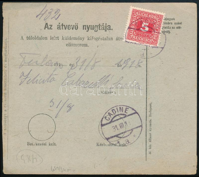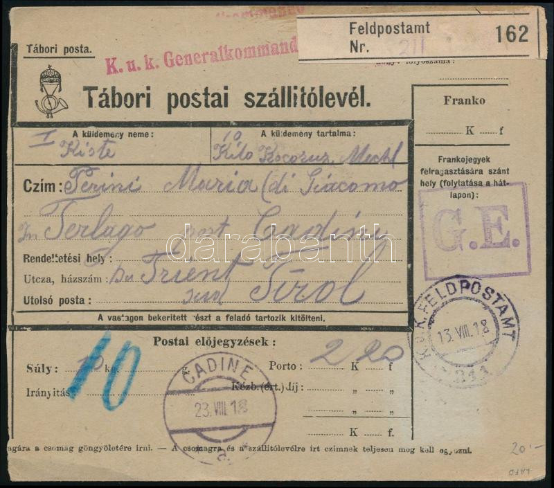 Beschreibung: 1918 Tábori postai szállítólevél 2h portóval / Field post parcel card with 5h postage due stamp "K.u.k. Generalkommando" + "FP 311"