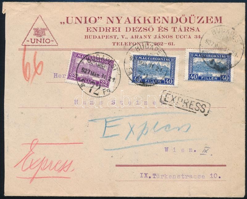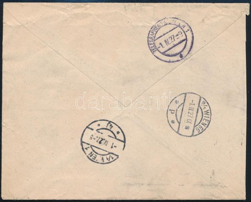 Beschreibung: 1927 Túlsúlyos expressz céges levél 1,12P bérmentesítéssel Bécsbe / Overweight express business cover to Vienna