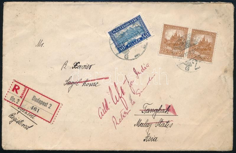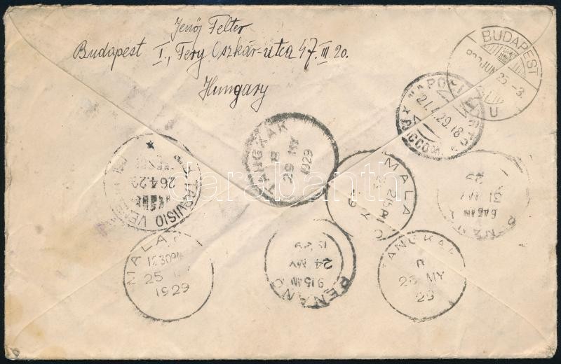 1929 Ajánlott levél Budapestről 90f bérmentesítéssel Malajziába, majd Szudánon át visszaküldve hajóval. Ritka postatörténeti dokumentum, a hátoldalon 8 db átmenő bélyegzéssel! / Registered cover from Budapest to Malaysia, then returned via Sudan by ship. Rare postal history document with 8 through stamps on the backside!
