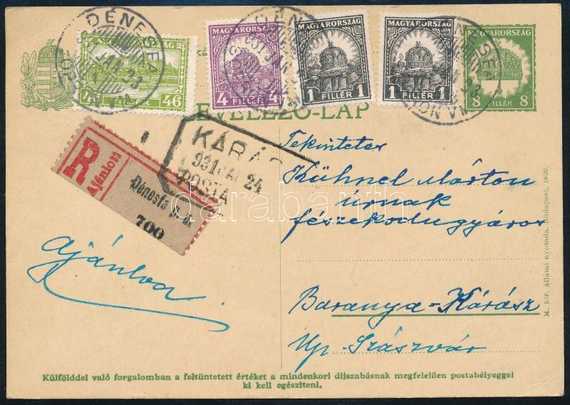 Beschreibung: 1931 Ajánlott levelezőlap 4 bélyeges kiegészítéssel "DÉNESFA / SOPRON VM." + "KÁRÁSZ" postaügynökségi bélyegzéssel / Registered postcard with postal agency postmark