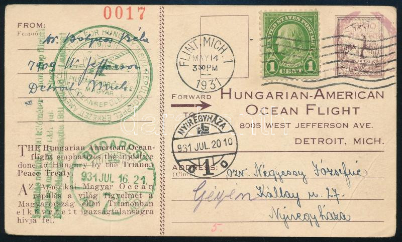 Beschreibung: 1931 Justice for Hungary légi képeslap az Egyesült Államokból Nyíregyházára, alkalmi bélyegzéssel / Airmail postcard, Hungarian-American ocean flight