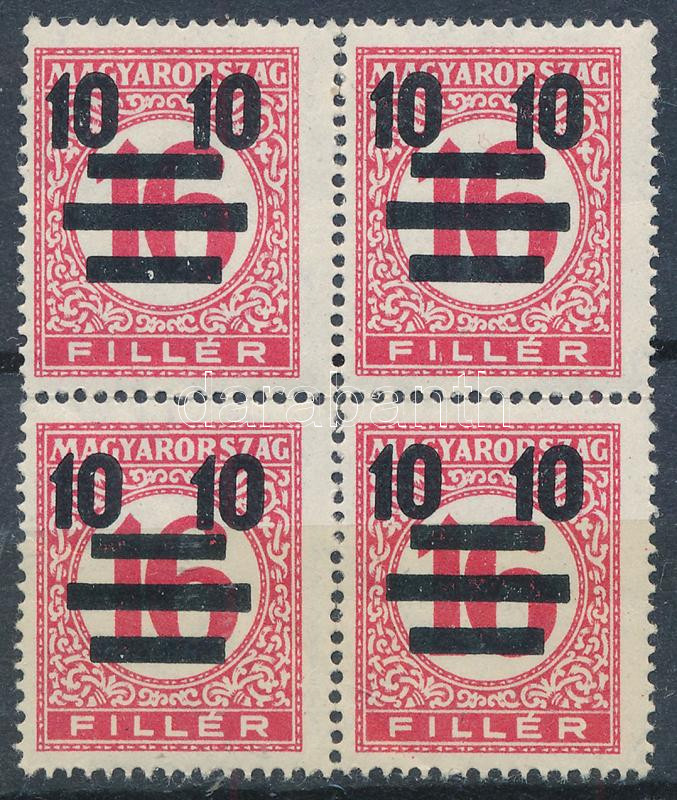 1931 Kisegítő portó 10/16f négyestömb IX-es vízjel / Mi 119 B block of... https://www.darabanth.com/de/45-Gross-Auktion/45.1/Philatelie-und-Postgesichte-Ungarn-Online/Pengo-Periode-1926-1944~18880/1931-Kisegito-porto-1016f-negyestomb-IX-es-vizjel-Mi-119-B-block-of-4~II2740166