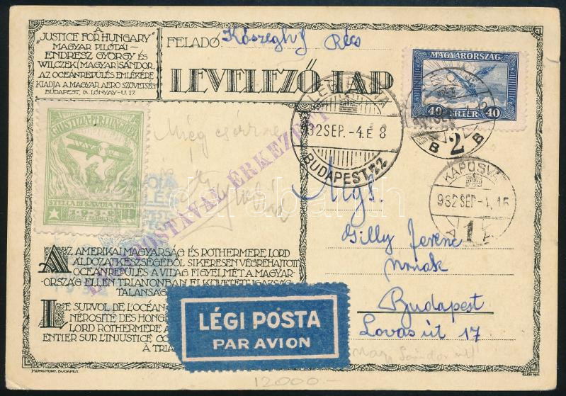 Beschreibung: 1932 Légi levelezőlap levélzáróval / Airmail postcard with label