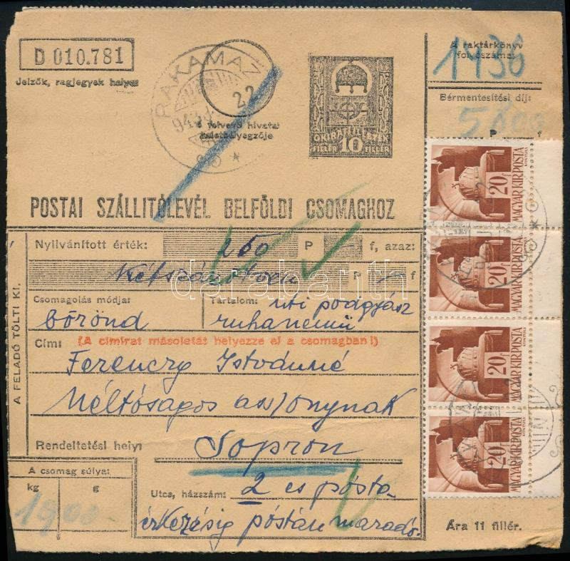 Beschreibung: 1943 Szállítólevél 29 db bélyeggel / Parcel card with 29 stamps "RAKAMAZ"