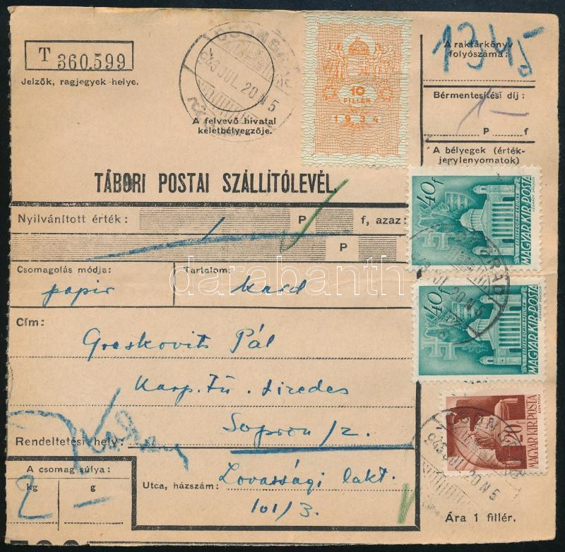 1943 Szállítólevél 3 bélyeg mellett 10f okmánybélyeggel / Parcel card ... https://www.darabanth.com/de/45-Gross-Auktion/45.1/Philatelie-und-Postgesichte-Ungarn-Online/Pengo-Periode-1926-1944~18880/1943-Szallitolevel-3-belyeg-mellett-10f-okmanybelyeggel-Parcel-card-with-fiscal-stamp~II3436941