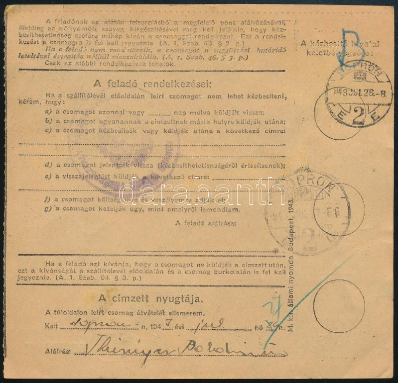 Beschreibung: 1943 Szállítólevél "NAGYPÁLL" postaügynökségi bélyegzéssel / Parcel card with postal agency postmark