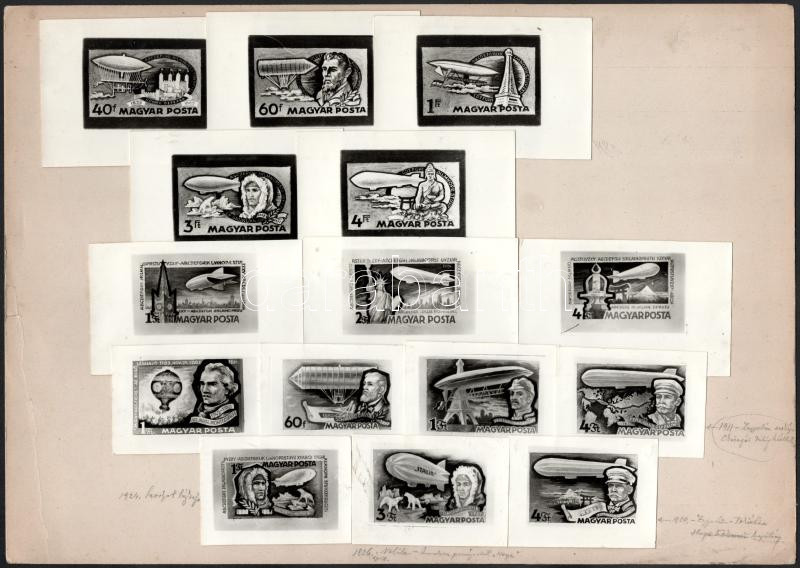 Beschreibung: Légrády Sándor 35 db bélyegtervét ábrázoló fotó 3 db kartonra felragasztva / 35 photos of Légrády essays