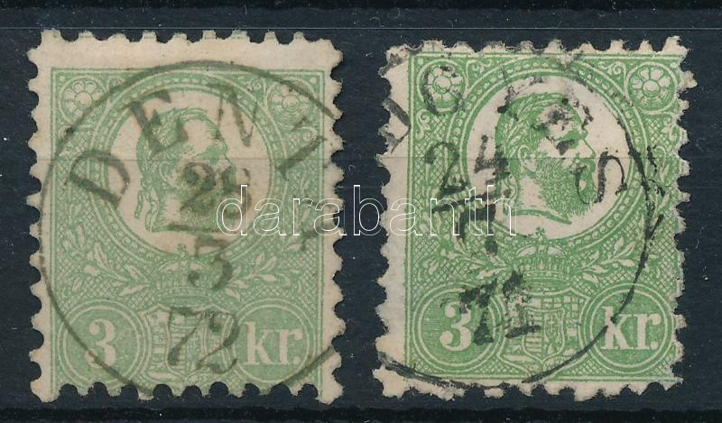 Beschreibung: 1871 2 db Kőnyomat 3kr világos zöld és zöld színben (1 bélyegen papírelvékonyodás) (320.000) / 2 x Mi 2 light green and green (thin paper on 1 stamp)