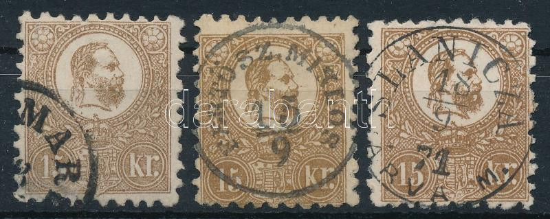 Beschreibung: 1871 3 db Kőnyomat 15kr klf színárnyalatban (1 bélyegen kis papírelvékonyodás) / 3 x Mi 5 in different colour shades (small thin paper on 1 stamp)