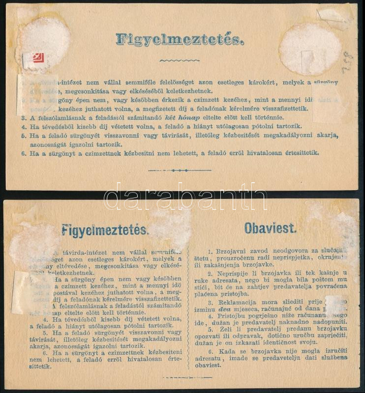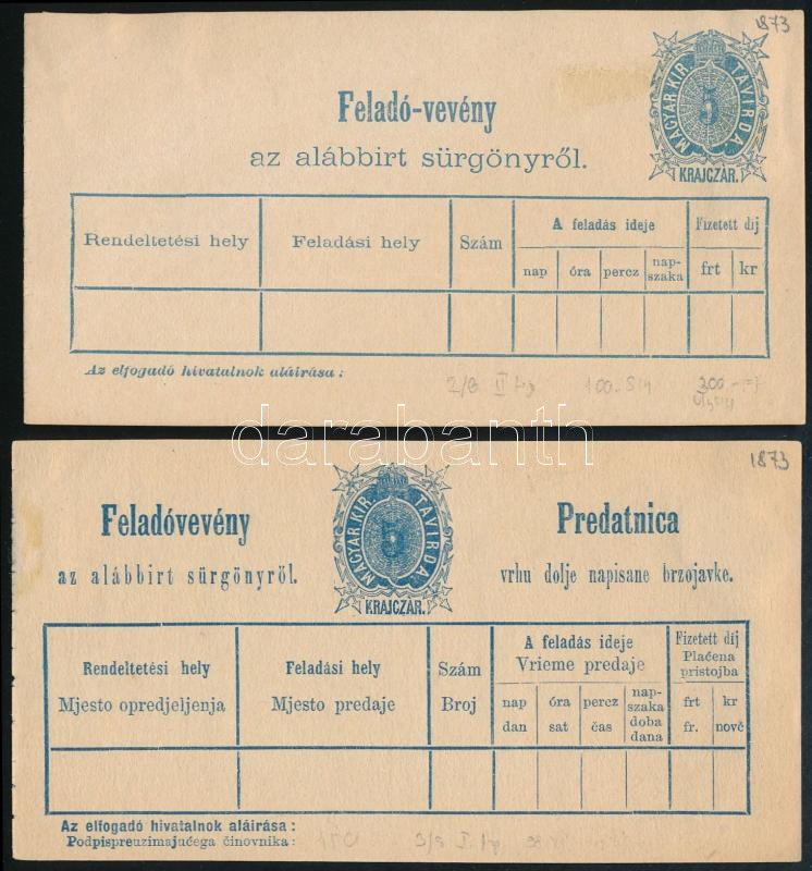 1873 2 db használatlan feladóvevény / PS-receipts https://www.darabanth.com/de/45-Gross-Auktion/45.1/Philatelie-und-Postgesichte-Ungarn-Online/Telegraphenmarken~18740/1873-2-db-hasznalatlan-feladoveveny-PS-receipts~II3445688