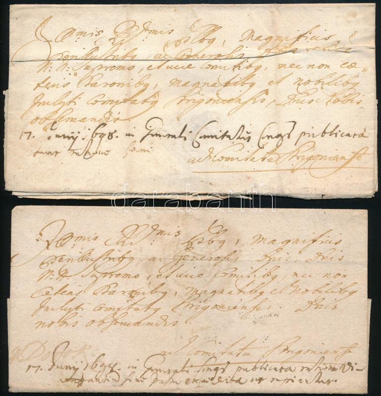 1698 2 db levél Esztergom vármegyébe / 2 covers https://www.darabanth.com/de/45-Gross-Auktion/45.1/Philatelie-und-Postgesichte-Ungarn-Online/Vorphilatelie~18725/1698-2-db-level-Esztergom-varmegyebe-2-covers~II3449876