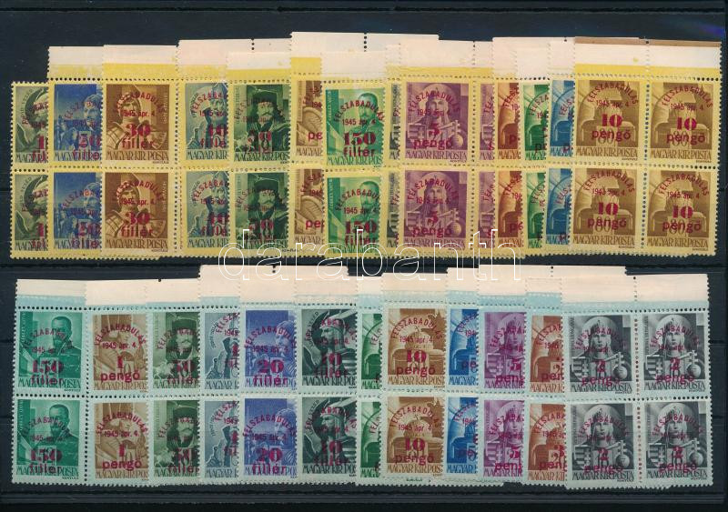 1945 Felszabadulás sor négyestömbökben / Mi 760-772 x+y blocks of 4 https://www.darabanth.com/de/45-Gross-Auktion/45.1/Philatelie-und-Postgesichte-Ungarn-Online/Zweite-Inflationsperiode-1945-1946~18883/1945-Felszabadulas-sor-negyestombokben-Mi-760-772-xplusy-blocks-of-4~II3448542