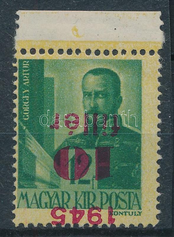 1945 Kisegítő IV. 10f/12f ívszéli bélyeg fordított felülnyomattal, Lei... https://www.darabanth.com/de/45-Gross-Auktion/45.1/Philatelie-und-Postgesichte-Ungarn-Online/Zweite-Inflationsperiode-1945-1946~18883/1945-Kisegito-IV-10f12f-ivszeli-belyeg-forditott-felulnyomattal-Leitold-vizsgalojellel-~II3447872