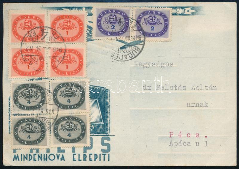 Beschreibung: 1946 (16. díjszabás) Levelezőlap 24 millió P bérmentesítéssel Budapestről Pécsre / Postcard with 10 stamps