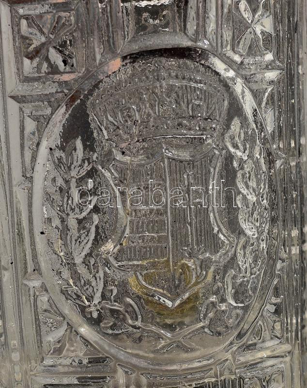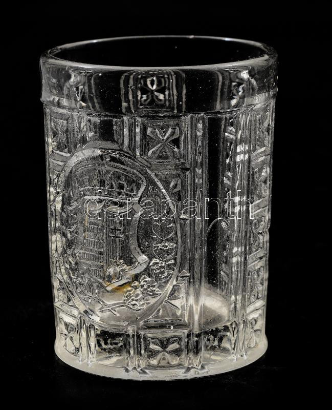 Emlékpohár magyar címerrel díszítve. cca 1880, formába fújt üveg, alján minimális pattogzással, m: 8 cm /// Commemorative glass decorated with the Hungarian coat of arms. Circa 1880, mold-blown glass, minimal chipping on the bottom, height: 8 cm.