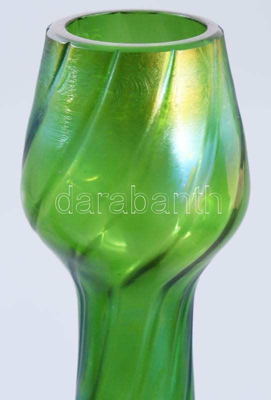 Jugendstil Lötz váza pár. Irizáló zöld hutaüveg. Jelzés nélkül 22 cm /// Jugendstil Lötz vase pair. Iridescent green art glass. Unsigned, height: 22 cm.