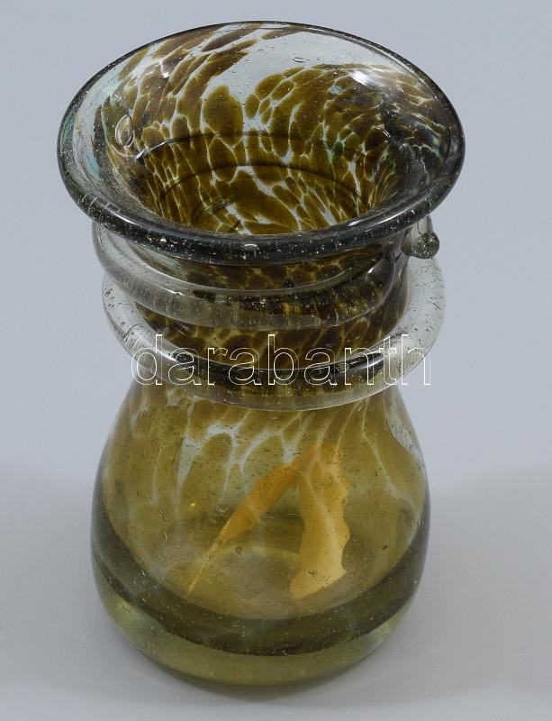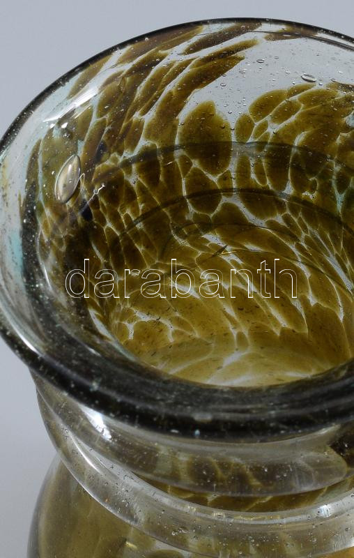 Pattantyús Gergely (1972) - Polyák János (1967-): Fémsókkal színezett hutaüveg váza. 1997, Bárdudvarnok, anyagában színezett hutaüveg, rátekert üvegszál díszítéssel. Jelzés nélkül, hibátlan, m: 10,5 cm /// Pattantyús Gergely (1972) - Polyák János (1967-): Metal saltcolored hut glass vase. 1997, Bárdudvarnok. Body-tinted hut glass with applied glass thread decoration. Unsigned, flawless condition, height: 10.5 cm