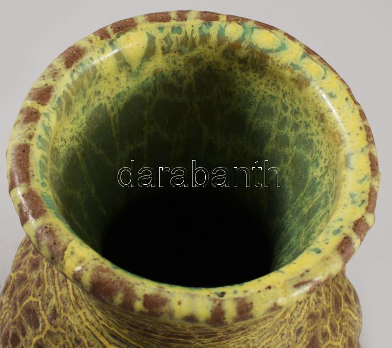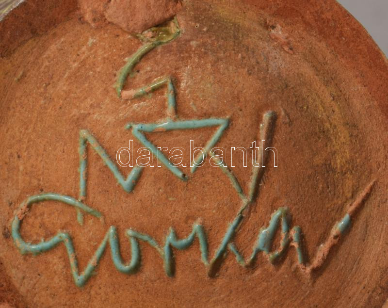 Beschreibung: Gorka Géza (1894-1971): Váza, vállánál hólyagos dÃszÃtéssel. Korongozott és kézzel mintázott cserép. Jelzett: alján masszába karcolt GNV háromszöggel Gorka. Aljánál kis mázpattogzásokkal, m: 16,5 cm /// Geza Gorka (1894-1971): Vase, with blister decoration at the shoulder. Wheel-thrown and hand-shaped earthenware. Signed: incised into the clay at the base with a triangular GNV and "Gorka." Minor glaze chips at the base, height: 16.5 cm.