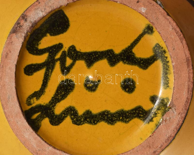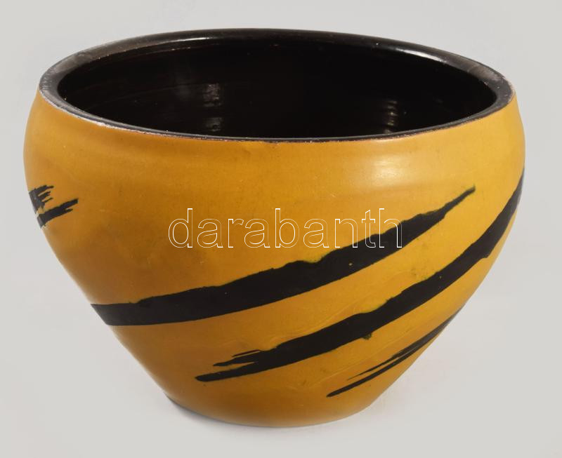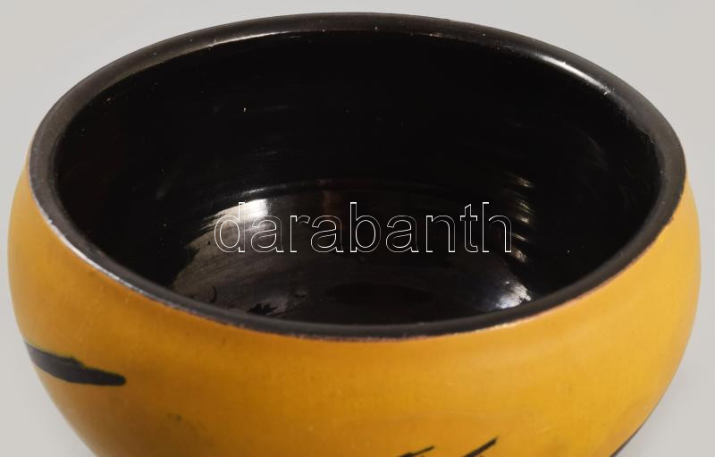 Beschreibung: Gorka Lívia (1925 - 2011): Váza. Fekete, sárga mázakkal festett kerámia, apró mázhibával. Jelzett: Gorka Lívia. d: 16 cm