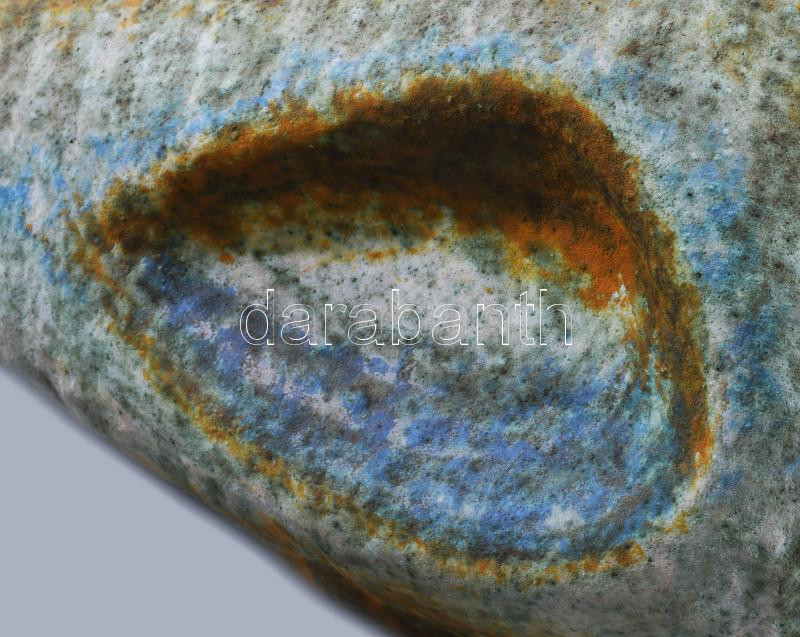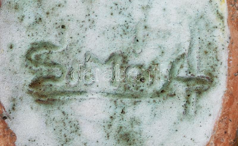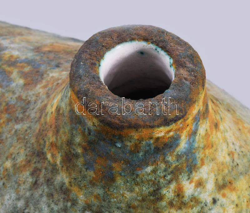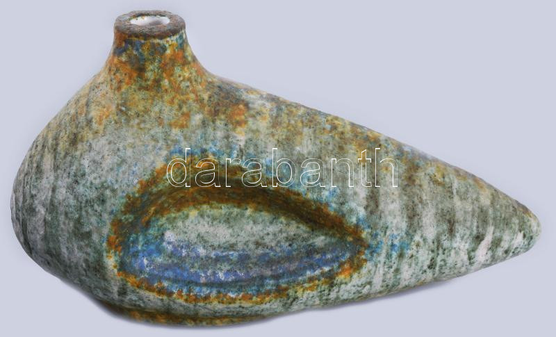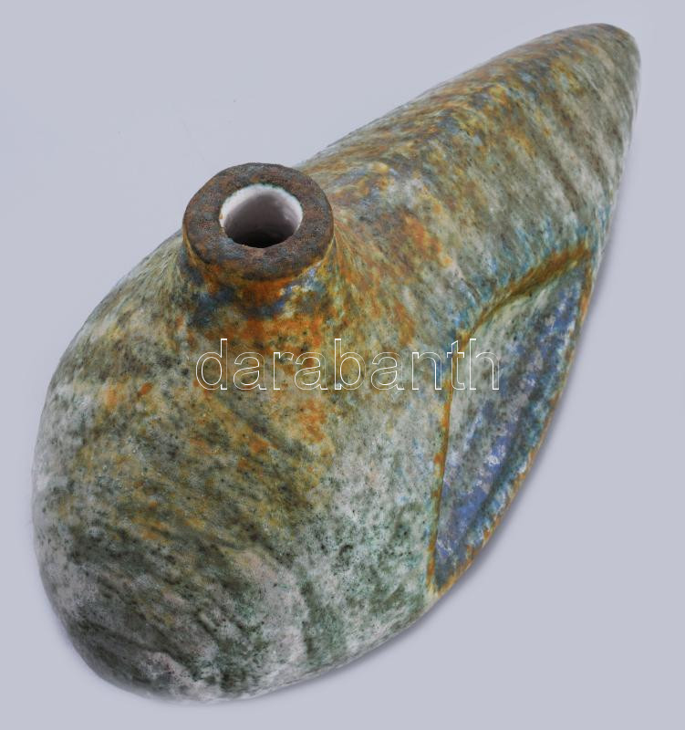 Simó Ágoston (1925-2011): Fekvő kavicsváza. Magas hőfokon égetett, rézoxiddal színezett, samottos agyag. Alján jelzett. Hibátlan, élénk színvilággal, 35x18 cm /// "1943-49: Magyar Iparművészeti Főiskola kerámia szak, mestere: Borsos Miklós, Gádor István, Molnár Elek és Ohmann Béla volt. 1957: Iparművészeti Pályázat I. és II. díj; 1960: Iparművészeti Pályázat I. és III. díj; 1985: Magyar Alkotóművészek Országos Egyesülete-díj; 2002: Ferenczy Noémi-díj. 1950-től a Gránit Kőedény és Porcelángyár, 1952-54 között pedig a Kerámia Iparművészeti Szövetkezet tervezőjeként dolgozott. 1954-től szabadfoglalkozású művész. A Siklósi Kerámia szimpóziumon 1972-ben és 1976-ban vett részt. Tevékenységi köre a kerámia teljes területére kiterjed, ezen belül jelentős szerepet kaptak a figurális plasztikák, a murális feladatok, továbbá a cserépkályhák."