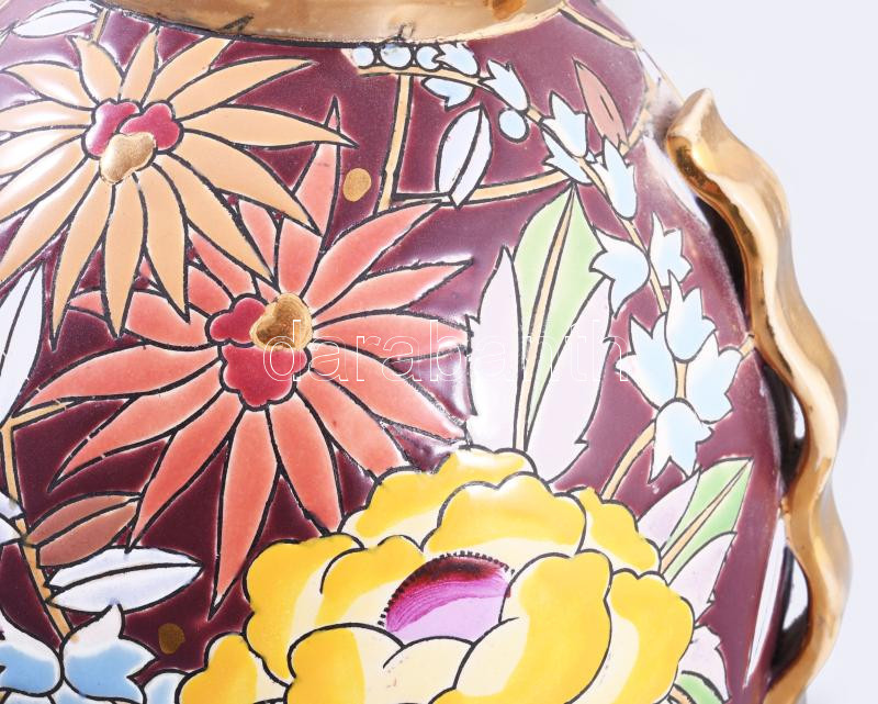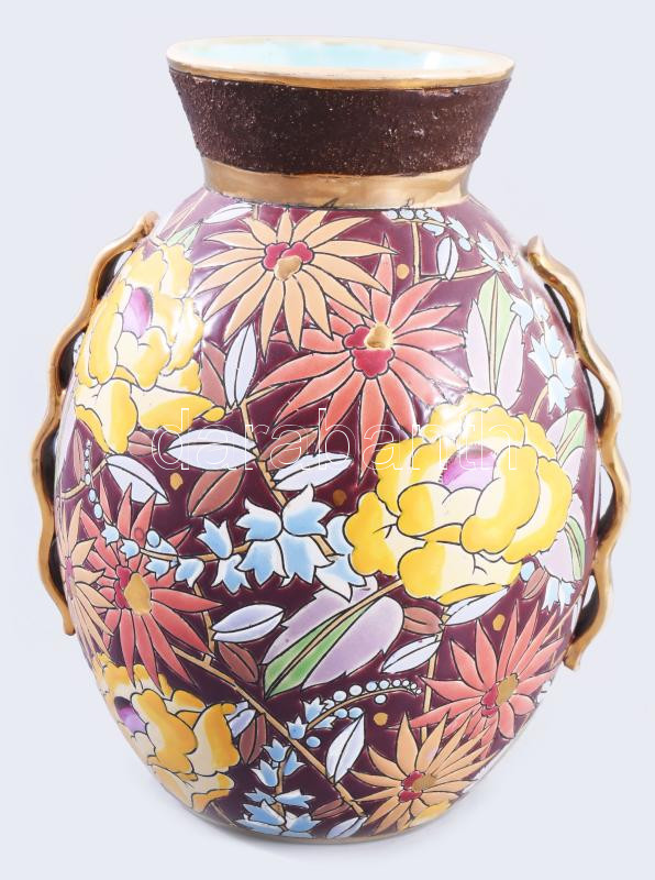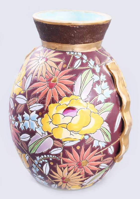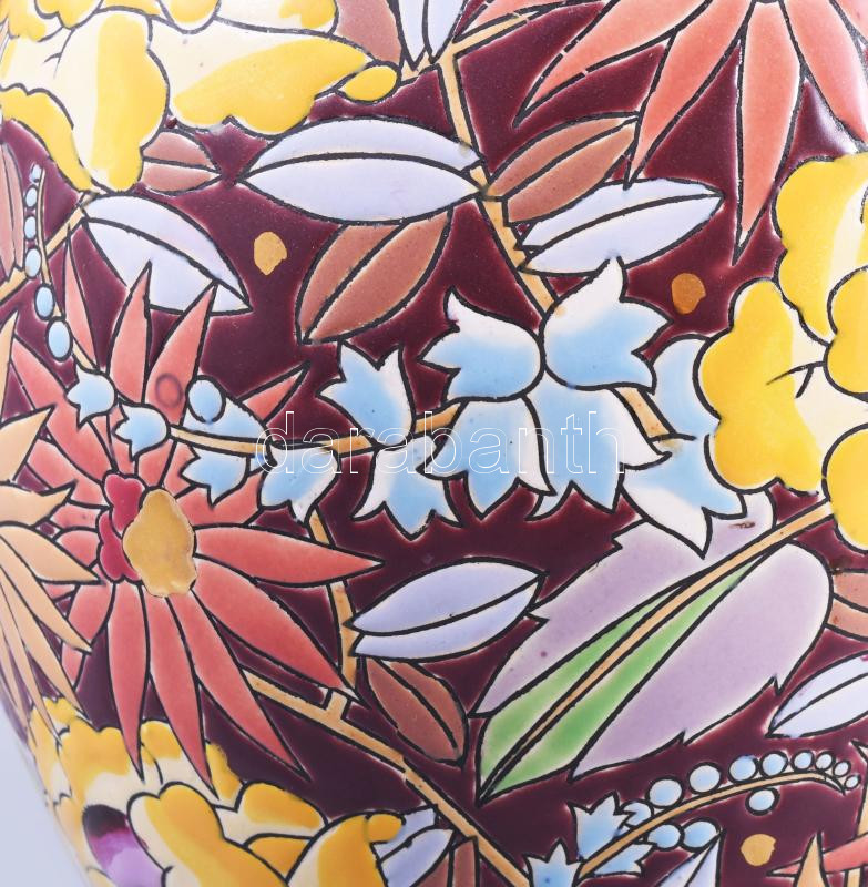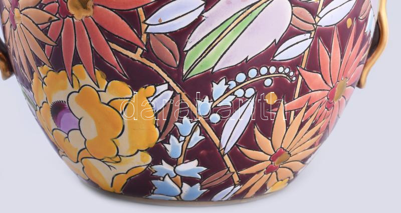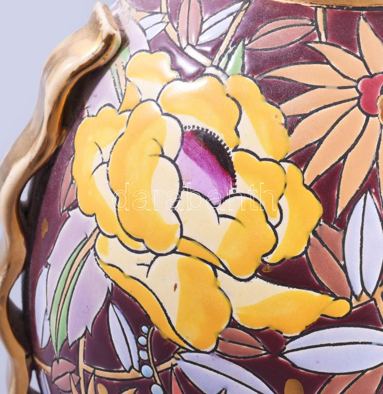 Virágos art deco Mikado váza Boch & Fréres, Belgium cca 1920. Dekorterv: Raymond Chevallier. Kézzel festett plasztikus, aranyozott, jelzett, hibátlan 24 cm