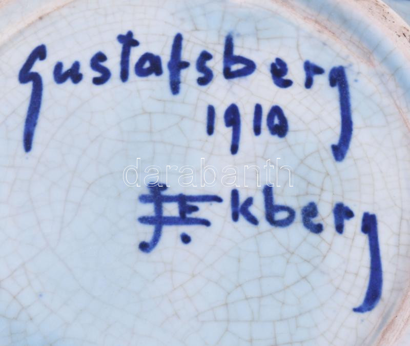 Gustafsberg Fabriks-Interessenter A.B., Josef Ekberg (1877-1945) tervező: "Sgrafitto" váza. Jelzett, alján kékkel, kézzel festve: Gustafsberg / 1910 / J Ekberg. Gömbölyded vázatest egyenes nyakkal, rajta világoskék-fehér alapból enyhén kidomborodó növényi ornamentika - virágzó lóherék. Hibátlan, m: 13,5 cm /// Gustafsberg Fabriks-Interessenter A.B., designer Josef Ekberg (1877-1945): "Sgraffito" vase. Marked on the base in blue, hand-painted: Gustafsberg / 1910 / J. Ekberg. Rounded vase body with straight neck, decorated with slightly raised plant ornamentation in light blue and white ground blooming clovers. Perfect condition. Height: 13.5 cm.
