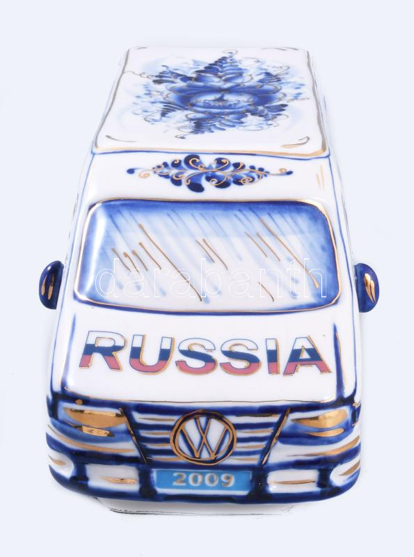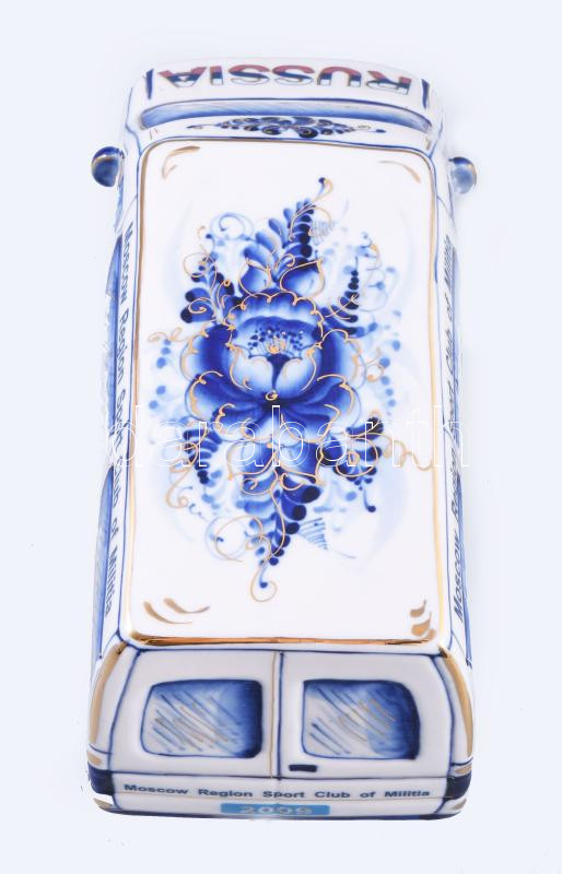 Beschreibung: Gzhel porcelán Volkswagen kisteherautó, International Police-Motor Corporation logójával, jelzett, kézzel festett, dobozában, hibátlan, 21x9x9 cm