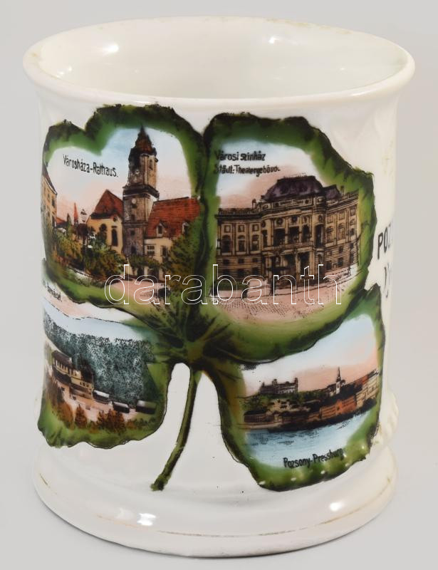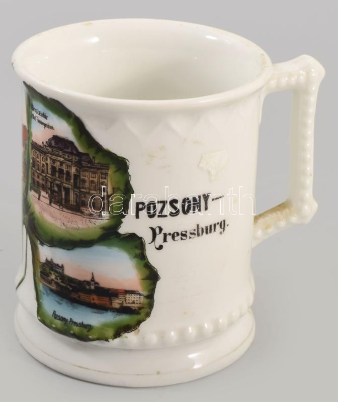 Pozsonyi emlékbögre. Pozsony-Pressburg felirattal, híres pozsonyi épületek ábrázolásával, cca 19. sz. második fele, jelzés nélkül, kis kopással, m: 9,5 cm /// Bratislava souvenir mug. With Pozsony-Pressburg inscription and depictions of famous Bratislava buildings, circa second half of the 19th century, unmarked, minor wear, height: 9.5 cm.