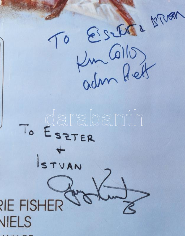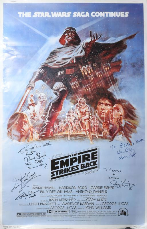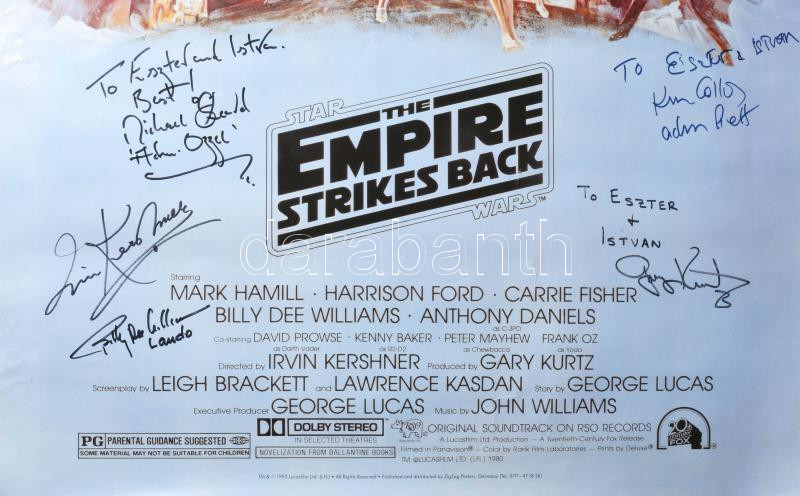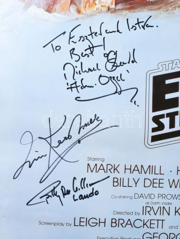 1993 Star Wars - The empire strikes back. Filmplakát számos autográf aláírással: Billy Dee Williams színész (a filmben Lando Calrissian, 1937-), Irvin Kershner rendező (1923-2010), Gary Kurtz producer (1940-2018), Kenneth Colley (a filmben Admiral Firmus Piett, 1937-2025), Michael Sheard színész (a filmben Admiral Kendal Ozzel, 1938-2005). 2003-ban az Echo Base Charity Con 2003-ban, Hollandiában, Nieuwegein városban rendezett évi konferencián került a plakát aláírásra. Ofszet, papír. ZigZag Posters, Németország kiadása, 1993. One sheet B változat. 102×67,5 cm / 1993 Star Wars - The empire strikes back movie poster, with several autograph signatures: Billy Dee Williams actor (in the movie Lando Calrissian, 1937-), Irvin Kershner director (1923-2010), Gary Kurtz producer (1940-2018), Kenneth Colley (in the movie Admiral Firmus Piett, 1937-2025), Michael Sheard actor (in the movie Admiral Kendal Ozzel, 1938-2005). Signed in 2003 during the Echo Base Charity Con, in Nieuwegein, Netherlands . Ofset on paper. ZigZag Posters, Germany, 1993. One sheet B version. 102×67,5 cm