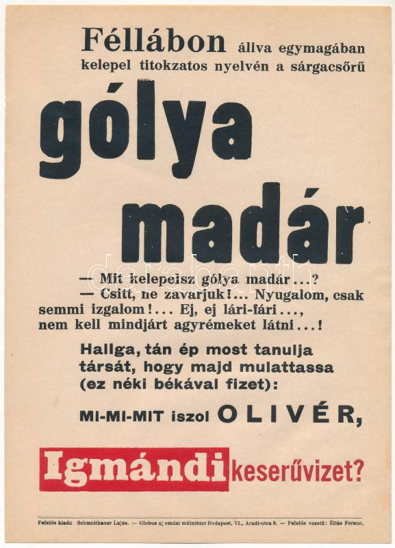 "Gólya madár (...)", Igmándi keserűvíz kisplakát, papír, Glo... https://www.darabanth.com/de/45-Gross-Auktion/45.1/Poster/Poster~19003/Golya-madar-Igmandi-keseruviz-kisplakat-papir-Globus-Nyomda-Bp-lapszeli-egesz~II3447170