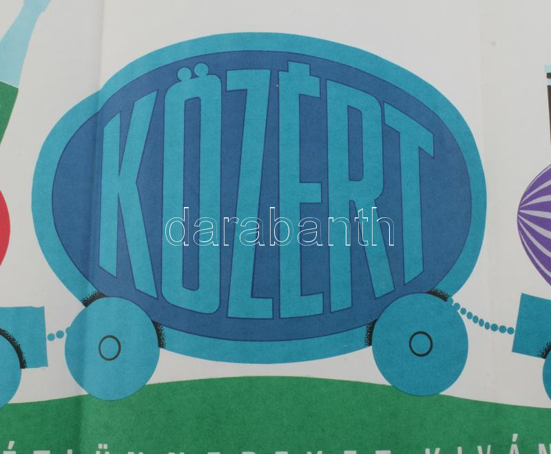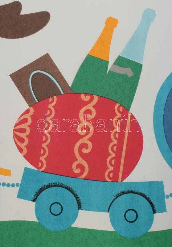 Gönczi-Gebhardt Tibor (1902-1994): Kellemes húsvéti ünnepeket kíván a Közért, 1971-75 körül. Reklámplakát, ofszet, papír, jelzett a plakáton. Offset és J. Nyomda. Hajtásnyomokkal. Sarkaiban apró lyukakkal. 28,5x81,5 cm