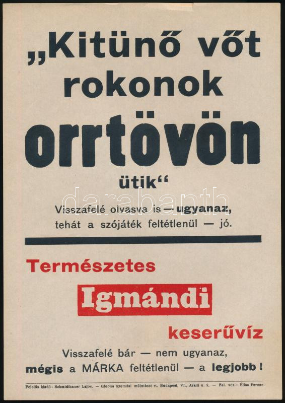 "Kitűnő vőt rokonok orrtövön ütik", Igmándi természetes kese... https://www.darabanth.com/de/45-Gross-Auktion/45.1/Poster/Poster~19003/Kituno-vot-rokonok-orrtovon-utik-Igmandi-termeszetes-keseruviz-kisplakat-papir-Glob~II3447053